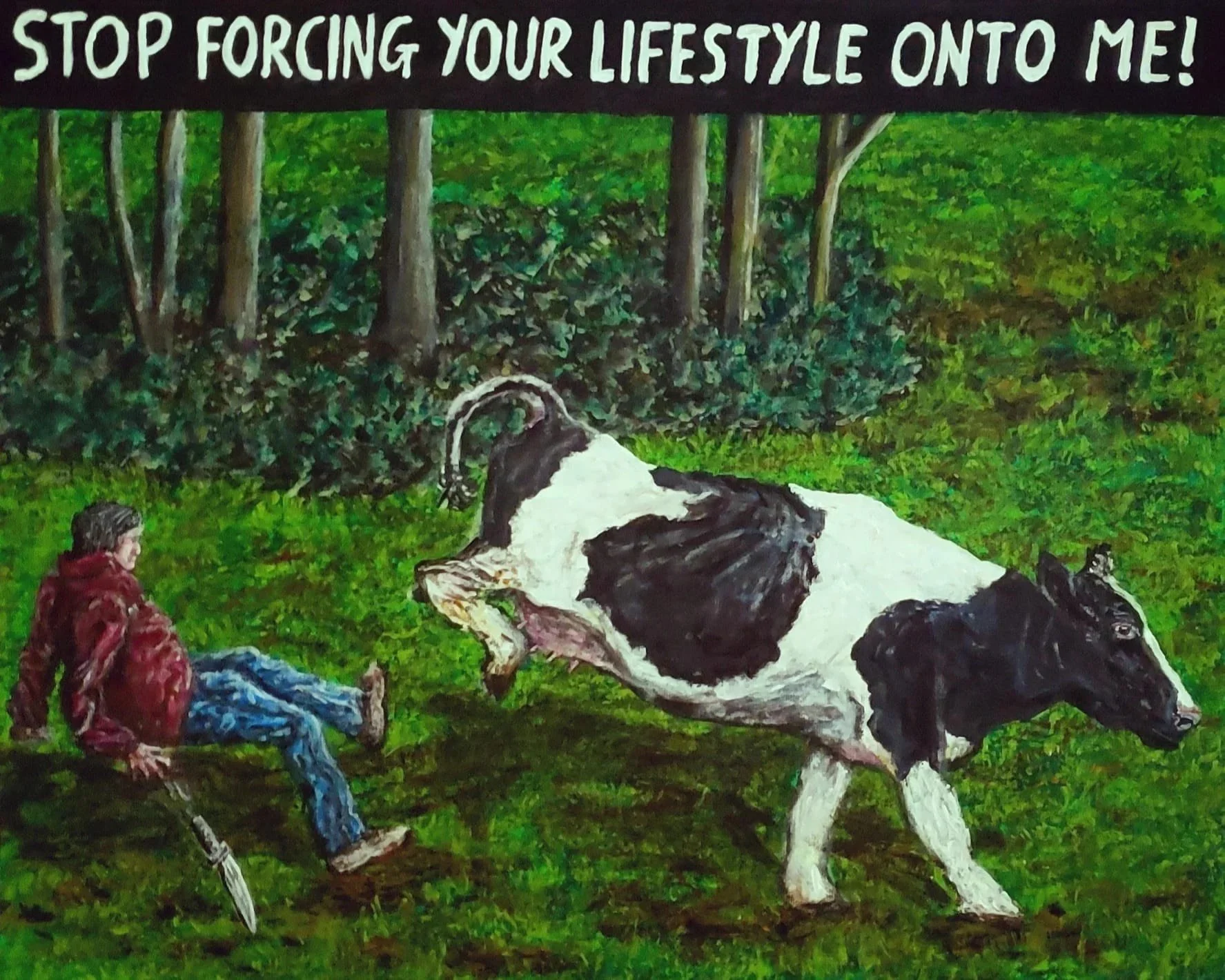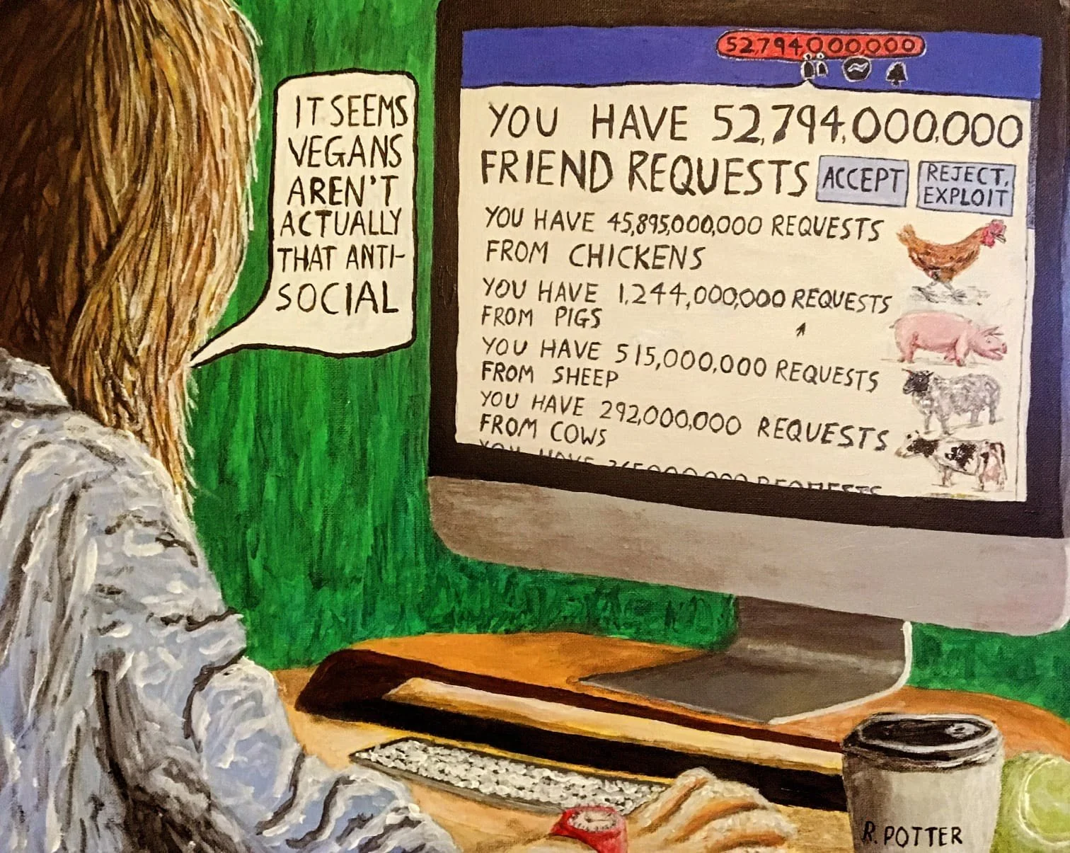 Robbie Potter, a vegan artist specializing in expressive acrylic paintings, infuses his impressionistic style with animal rights themes. Robbie's vibrant canvases invite viewers to contemplate the interconnectedness of all life. He also works at an animal sanctuary, bringing insight into the individuality of species within a safe environment.